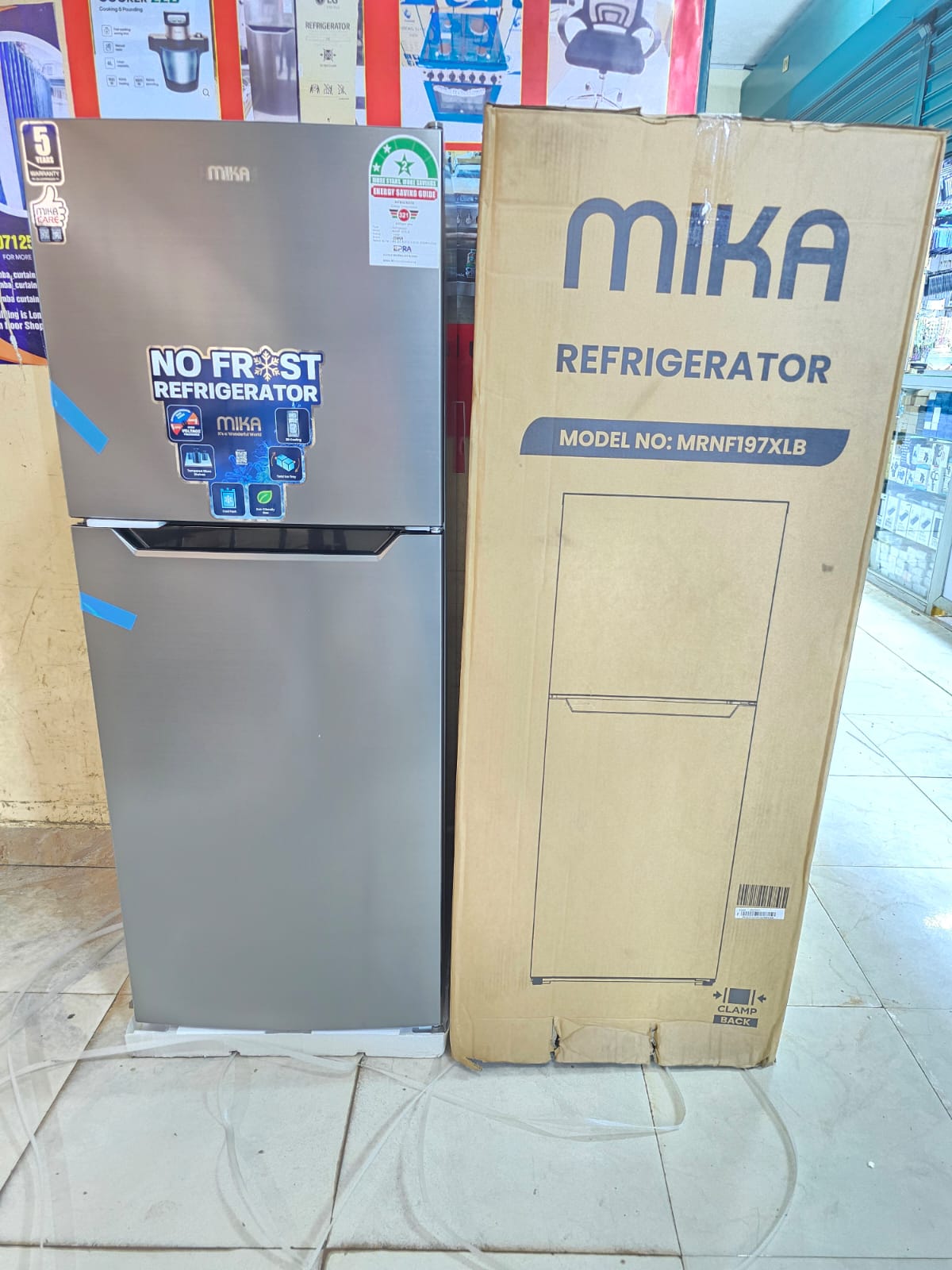 The Mika 197L No Frost Double Door Refrigerator is a sleek and efficient appliance designed to meet the storage needs of modern households. With a total capacity of 197 liters—145L in the fridge and 52L in the freezer—it offers ample space for your food storage requirements.